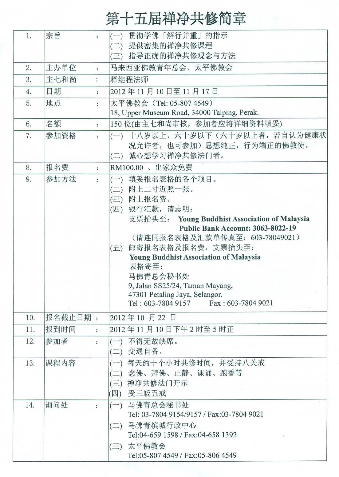 馬佛青總會與太平佛教會將於2012年11月10日至17日,假太平佛教會聯合主辦第十五屆禪淨共修。其宗旨乃貫徹學佛「解行並重」的指示;提供密集的禪淨共修課程及指導正確的禪淨共修觀念與方法。 主辦當局禮請馬佛青宗教導師釋繼程法師主持此項共修課程。課程內容:每天約十小時共修時間,並授持八關齋戒。共修的項目包括念佛、拜佛、止靜、課誦、跑香等,以及禪淨共修法門開示。 凡是年齡介於18至60歲,或60歲以上而自認為健康狀況允許者、思想純正、行為端正的佛教徒;或者誠心想學習禪淨共修法門者皆可參加。錄取名額為150位,報名費RM100、出家眾免費。 此禪淨共修的報名截止日期為2012年10月22日。有興趣參加者請盡速報名,以免向隅。 下載宣傳報名表格單: