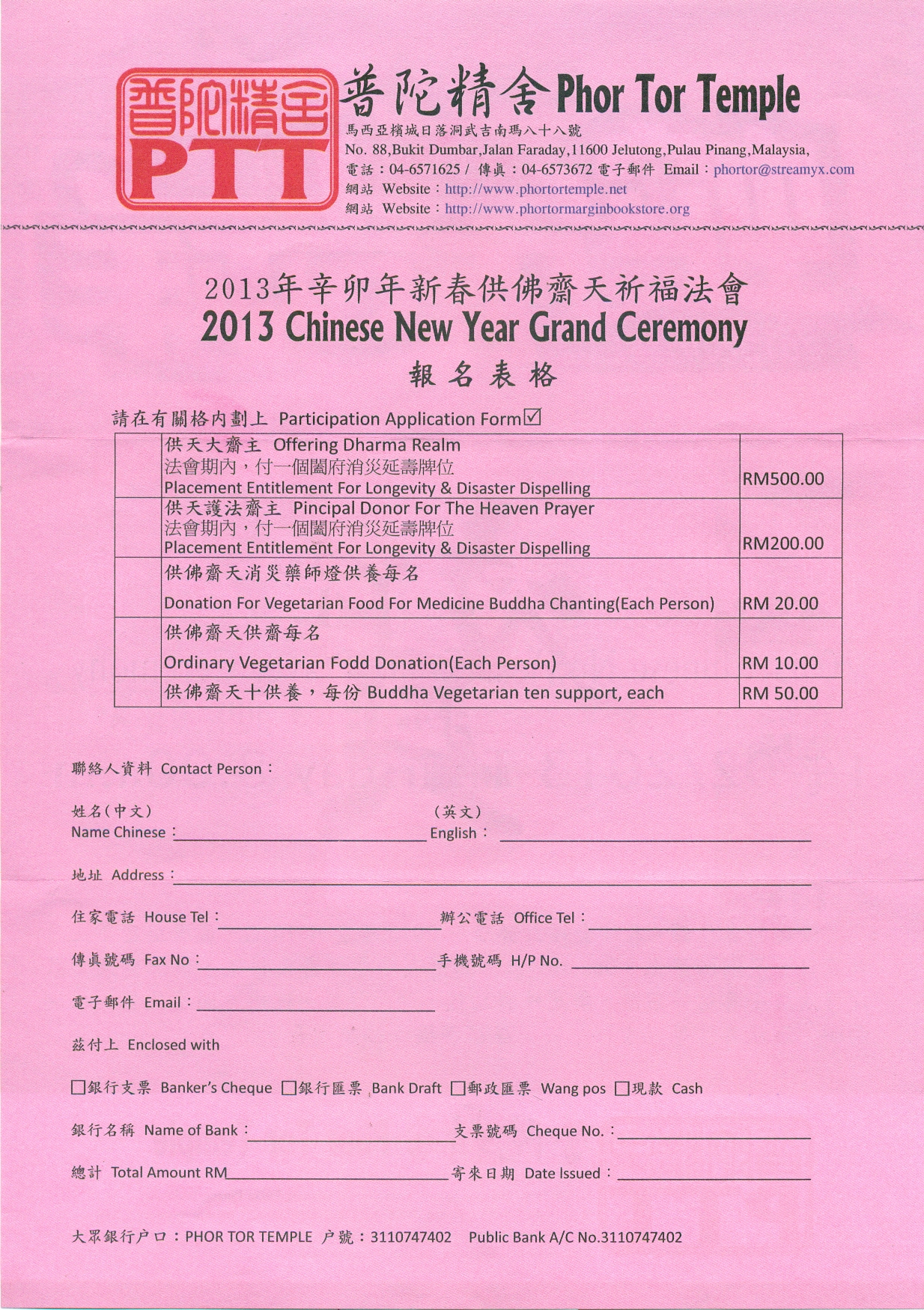 欣逢新春佳節,本精舍謹訂於陽曆2013年2月14日,農曆癸巳年正月初五日,星期四早上8.00a.m,恭請高僧大德虔誦齋天科儀,供佛齋天,歡迎護法居士善信等蒞臨,集此殊勝功德,迴向法界,祝禱 國泰民安 風調雨順 護法善信等 吉祥平安 厚植菩提 福慧增長。