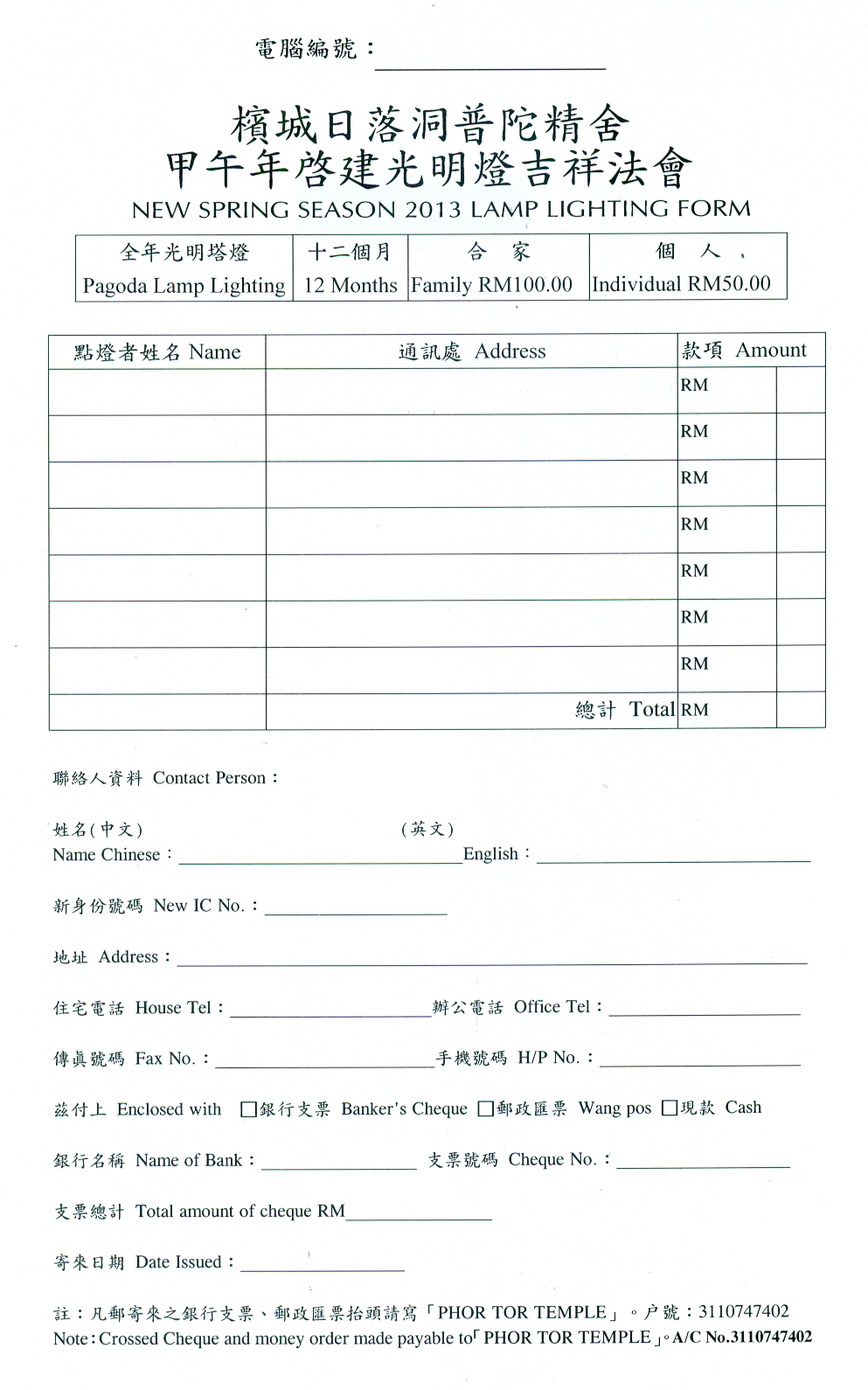 本精舍將於2014年1月30日(農曆癸巳年十二月三十日)星期四開始點燈至2015年2月18日(農曆甲午年十二月三十日)星期三,一年一度的全年燈,您在2013年已點燈,現您是否要在2014年新春繼續點燈,如要請您前來報名參加。