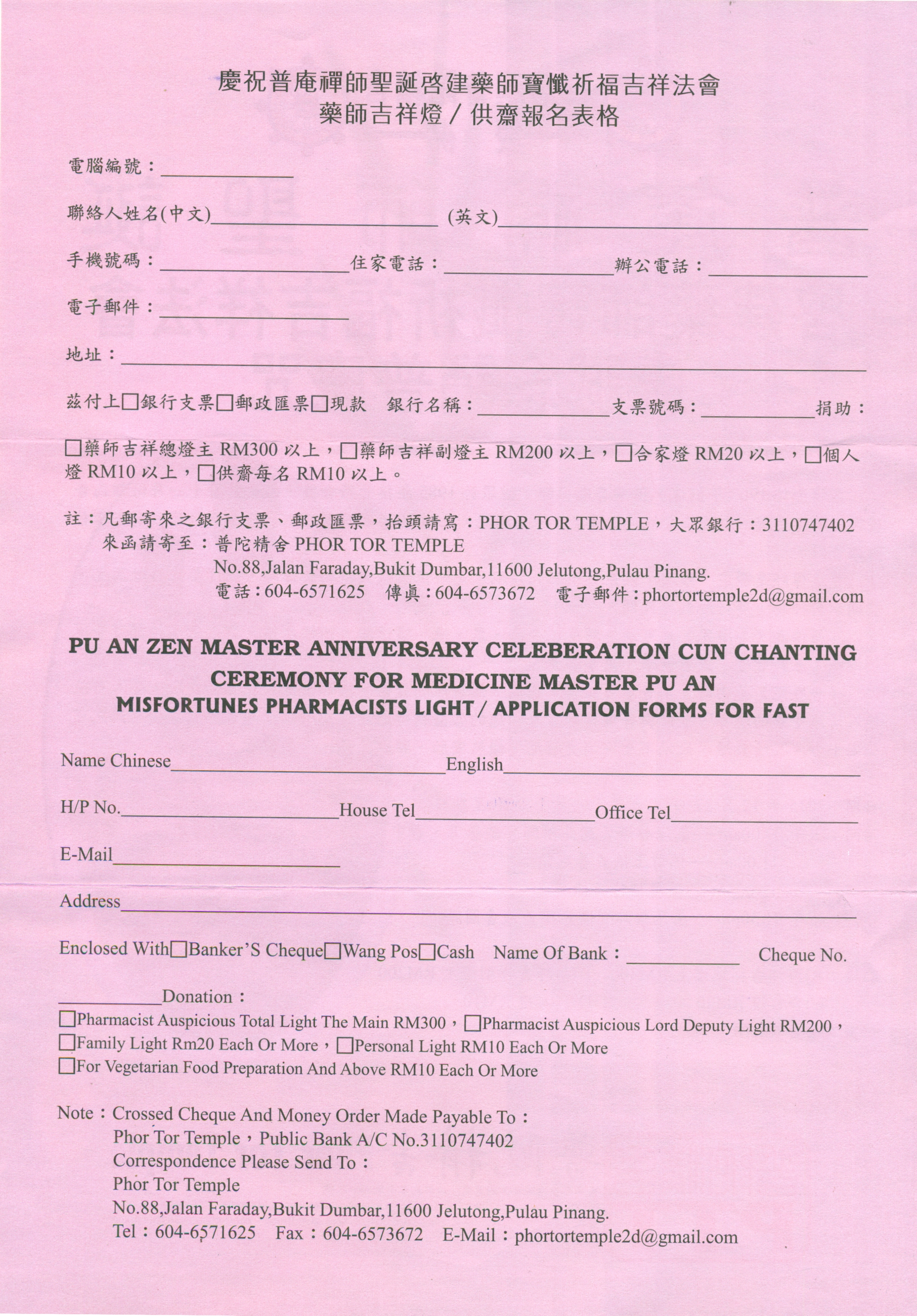 點燈:A)藥師吉祥總燈主RM300 B)藥師吉祥副燈主RM200 C)合家燈RM20 D)個人燈RM10 供齋:每名RM10